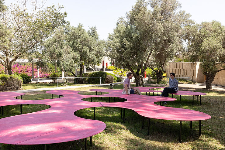ה"איים הוורודים" נוצרו כאדוה לטלטלה שיצרה מגיפת הקורונה. רינת יצחק ואלון שיקאר מציעים דרך מיטיבה לאחות את שברי התקופה באמצעות פיסול מרחבי המניע מפגש ואינטראקציה ומעודד חזרה חושית אל הקשר האנושי. צורתה של העבודה נולדה מתוך רשתות נוירונים שמורכבות מיחידות בודדות והיא פועלת עצמאית אך מסונכרנת כגוף אחד שלם. המשטח האמורפי מצופה טיח עשוי מאדמה מקומית ומיושם בשיטה מזרח תיכונית מסורתית, ומשמש כבסיס צבעוני לפעילויות מגוונות.